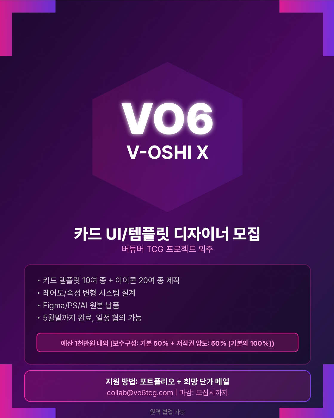 개인세 버추얼 팀 ‘TEAM VAGABOND’(이하 배가본드)가 2기 버추얼 크리에이터를 모집한다. 배가본드는 하찬찬, 슈타, 도르, 건수로 구성된 팀으로, SOOP에서 활동할 인원을 대상으로 지원을 받는다. 모집 기간은 2026년 2월 23일부터 4월 3일 오후 11시 59분까지며 모집 인원은 미정이다. 지원은 공고에 기재된 구글 폼으로 접수하고, 작성 문서는 1차 서류 심사에 활용된다. 이번 모집은 3D 모델 기반 버추얼 팀 합류를 전제로 한다. 공고에 따르면 합류자는 3D 모델을 제작해야 하며 팀복이 제공된다. 팀 기본 콘텐츠 외에도 개인 활동이 가능하고, 팀 콘텐츠는 잡담·게임·노래 등 캐릭터를 강조하는 형태로 구성 중이라고 안내됐다. 지원 자격은 2007년생 이상 성인(성별 무관)이다. 주 3회 이상 회당 3시간 방송이 가능해야 하고 1년 이상 활동을 지속할 수 있어야 한다. 방송 장비와 컴퓨터 등 기본적인 송출 환경도 갖춰야 한다. 우대 사항으로는 시간적 투자가 비교적 자유로운 지원자, 팀 콘텐츠에 거부감 없이 참여할 수 있는 지원자, 팀 활동을 이끌 열정이 있는 지원자, 노래·토크 역량이 강한 지원자 등이 제시됐다. 배가본드는 특유의 확정된 세계관을 운영 중이며 새로운 멤버에게는 이에 맞춘 상세 캐릭터 설정과 구성이 필요하다고 밝혔다. 공고에 제시된 컨셉 키워드는 SF, 방랑자, 이능력자다. 팀이 예고한 세계관 속에서 새 멤버가 어떤 캐릭터로 합류할지 주목된다. 신청 링크 : https://docs.google.com/forms/d/e/1FAIpQLSc5wg9l6Dn2AxBY2Uv3M6CThGeqxnuGnbPgGDiKRJ8joT4TDg/viewform